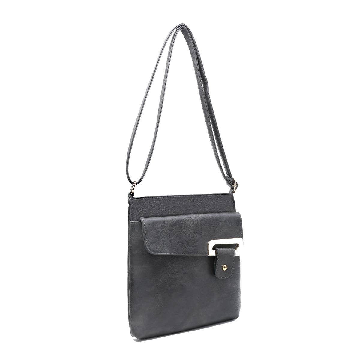 Cross Body Handbag with zip top sections, front pocket with flap over cover and 1 zipped pocket at the back, adjustable strap.
