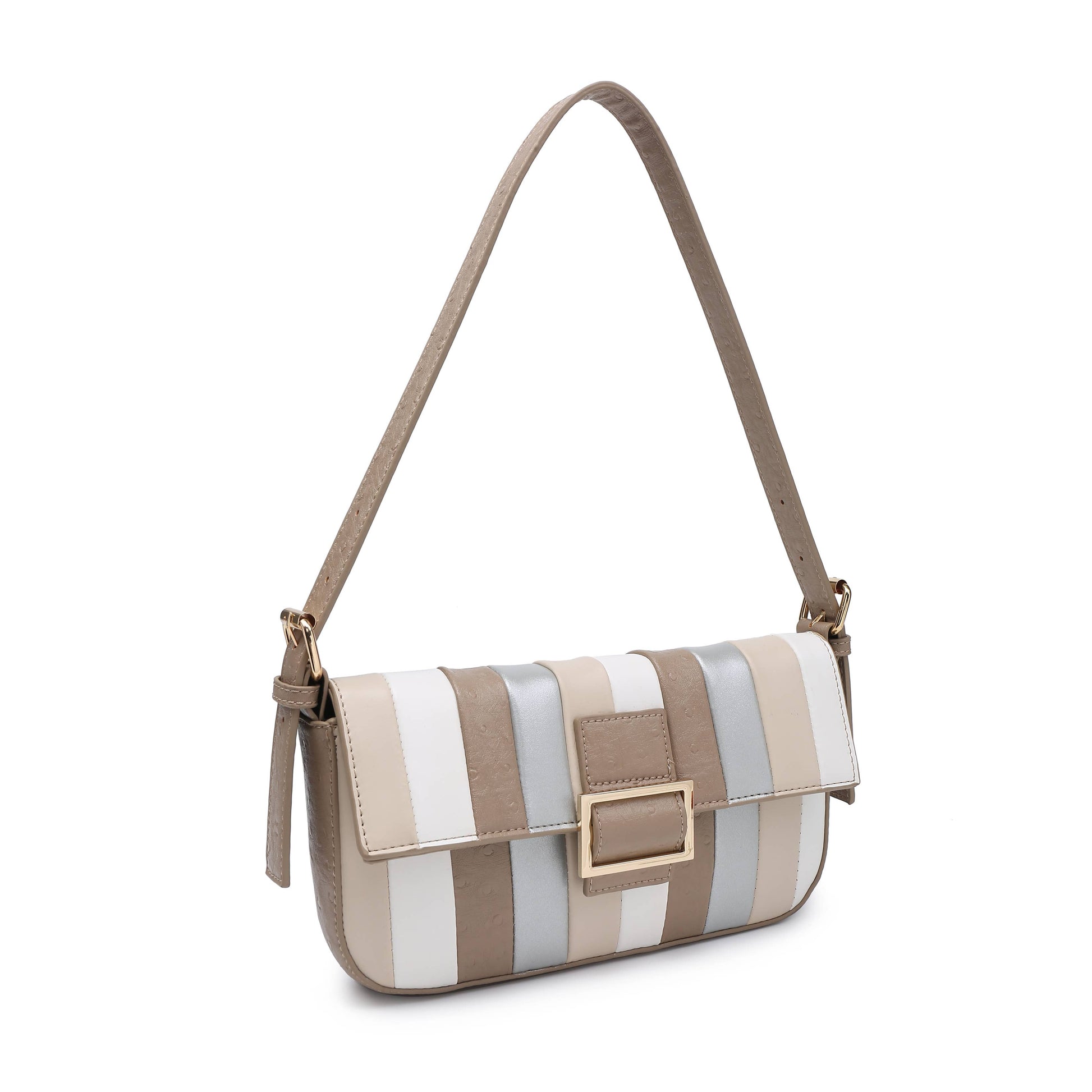 Shoulder Bag with Striped colour block pattern, flap with buckle detail, magnetic snap button closure, interior zipper pocket and slip pocket, PU shoulder strap.