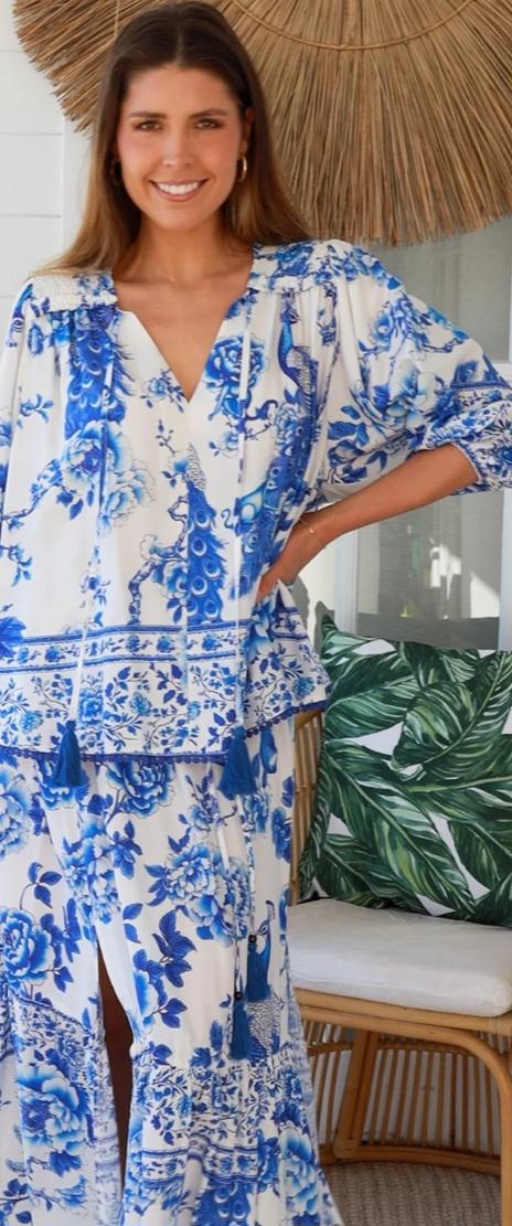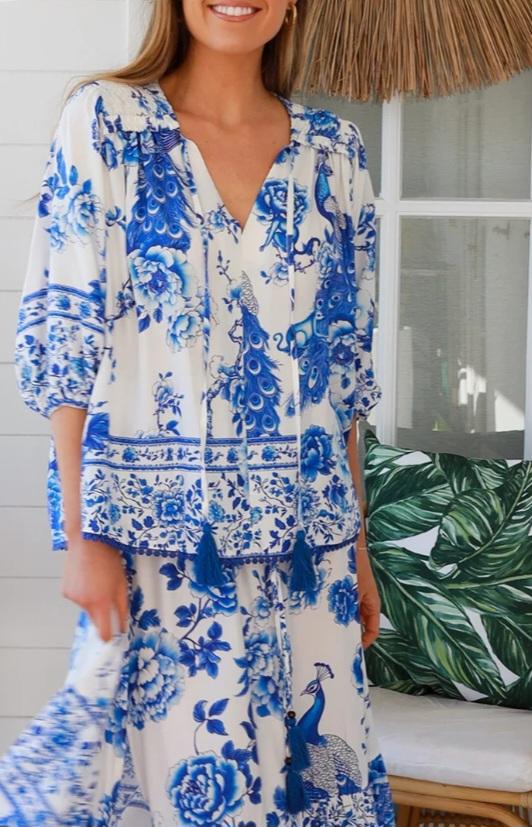 Blue & White Peacock Print Top – Rayon